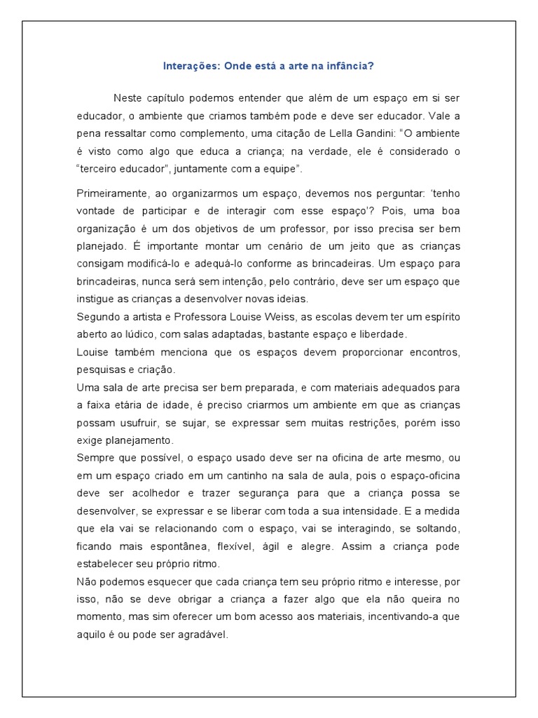 podem ser excelentes, mas para que isso aconteça é preciso pensar bem na maneira de oferecê-las e planejá-las. E.E.M Governador Celso Ramos Aluna: Nathielle Farias Turma: 4º magistério Professora orientadora: Siomara Disciplina: FUNDAMENTOS TEÓRICOS E METODOLÓGICOS DO ENSINO CURRICULAR DA EDUCAÇÃO INFANTIL E DOS ANOS INICIAIS. Livro: Interações: Onde está a arte na infância? Autora: Stela Barbieri Resumo: Capítulo 2, páginas 45-60 Joinville/2018