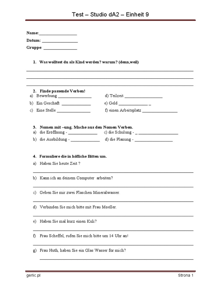 c) Eine Stelle _______________ f) einen Arbeitsplatz ________________