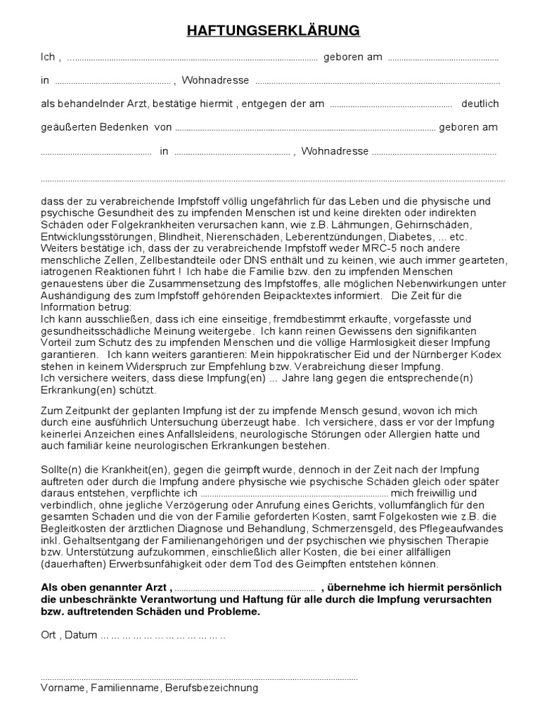 die unbeschränkte Verantwortung und Haftung für alle durch die Impfung verursachten