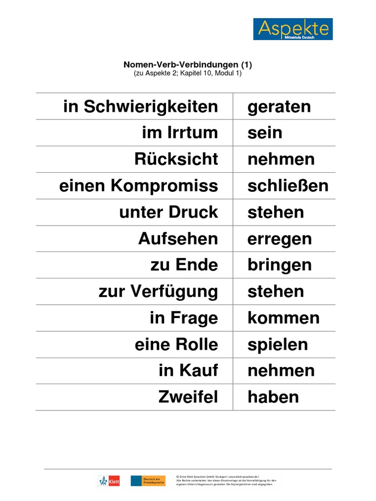 Kopieren Sie die Nomen-Verb-Verbindungen auf farbiges Papier,