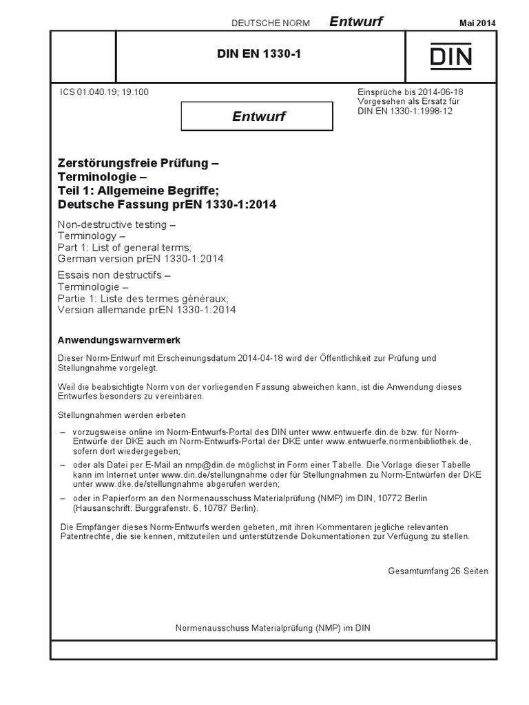 Dieses Dokument (prEN 1330-1:2014) wurde vom Technischen Komitee CEN/TC 138 „Zerstörungsfreie