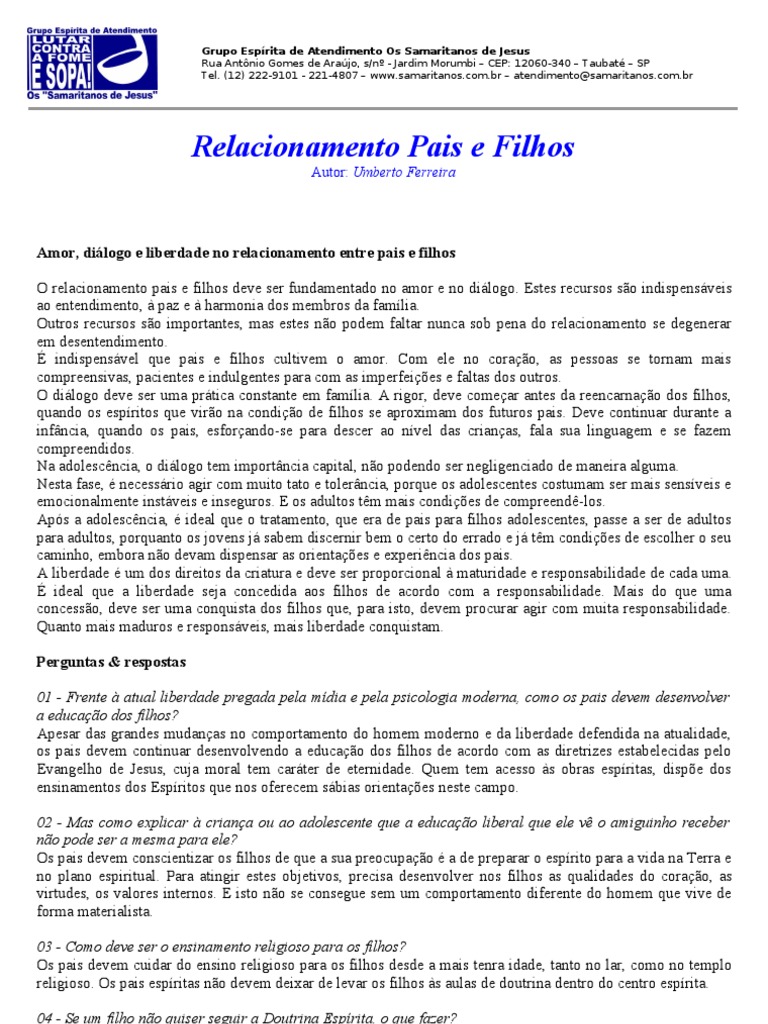 O relacionamento pais e filhos deve ser fundamentado no amor e no diálogo. Estes recursos são indispensáveis