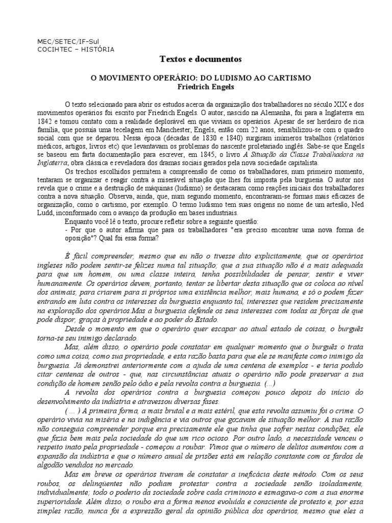 O texto selecionado para abrir os estudos acerca da organização dos trabalhadores no século XIX e dos