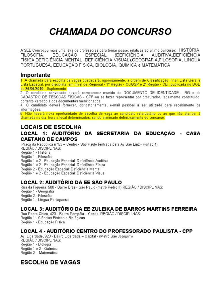 1. A chamada para escolha de vagas obedecerá, rigorosamente, a ordem de Classificação Final, Lista Geral e