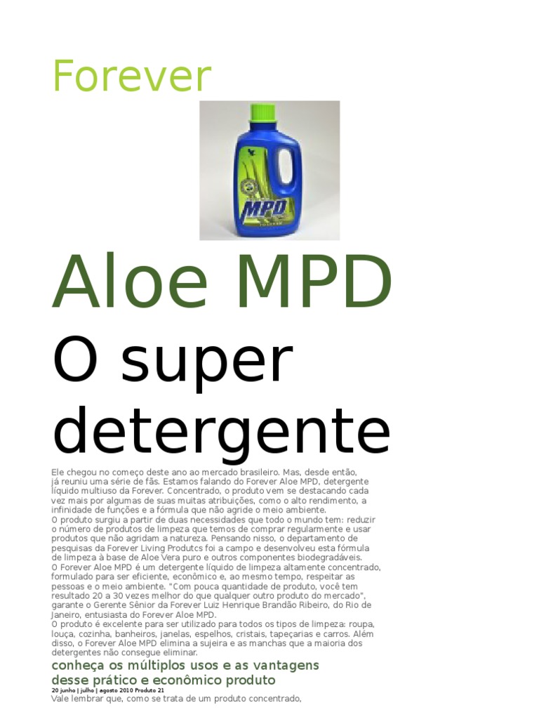 Ele chegou no comeo deste ano ao mercado brasileiro. Mas, desde ento, j reuniu uma srie de fs. Estamos falando do Forever Aloe MPD, detergente lquido multiuso da Forever. Concentrado, o produto vem se destacando cada vez mais por algumas de suas muitas atribuies, como o alto rendimento, a infinidade de funes e a frmula que no agride o meio ambiente. O produto surgiu a partir de duas necessidades que todo o mundo tem: reduzir o nmero de produtos de limpeza que temos de comprar regularmente e usar produtos que no agridam a natureza. Pensando nisso, o departamento de pesquisas da Forever Living Produtcs foi a campo e desenvolveu esta frmula de limpeza base de Aloe Vera puro e outros componentes biodegradveis. O Forever Aloe MPD um detergente lquido de limpeza altamente concentrado, formulado para ser eficiente, econmico e, ao mesmo tempo, respeitar as pessoas e o meio ambiente. Com pouca quantidade de produto, voc tem resultado 20 a 30 vezes melhor do que qualquer outro produto do mercado, garante o Gerente Snior da Forever Luiz Henrique Brando Ribeiro, do Rio de Janeiro, entusiasta do Forever Aloe MPD. O produto excelente para ser utilizado para todos os tipos de limpeza: roupa, loua, cozinha, banheiros, janelas, espelhos, cristais, tapearias e carros. Alm disso, o Forever Aloe MPD elimina a sujeira e as manchas que a maioria dos detergentes no consegue eliminar.