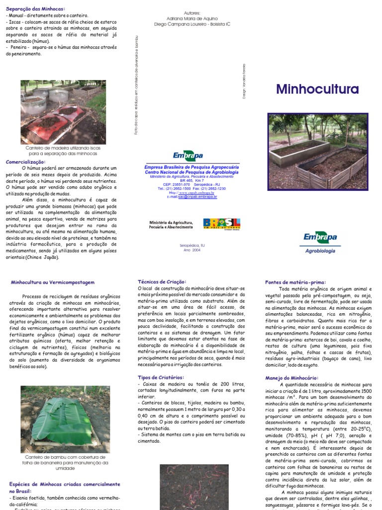 Processo de reciclagem de resduos orgnicos atravs da criao de minhocas em minhocrios, oferecendo importante alternativa para resolver economicamente e ambientalmente os problemas dos dejetos orgnicos, como o lixo domiciliar. O produto final da vermicompostagem constitui num excelente fertilizante orgnico (hmus) capaz de melhorar atributos qumicos (oferta, melhor reteno e ciclagem de nutrientes), fsicos (melhoria na estruturao e formao de agregados) e biolgicos do solo (aumento da diversidade de organismos benficos ao solo).