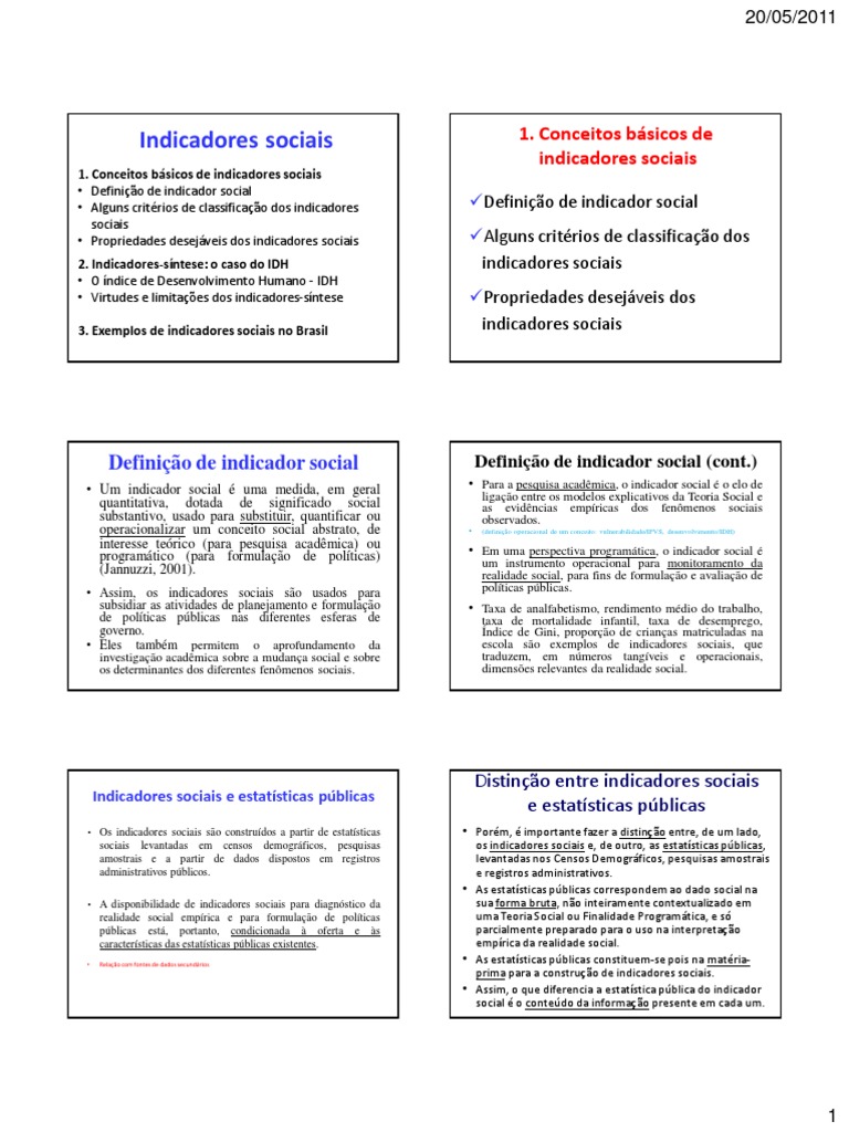 1. Conceitos bsicos de indicadores sociais Definio de indicador social Alguns critrios de classificao dos indicadores sociais Propriedades desejveis dos indicadores sociais 2. Indicadores-sntese: o caso do IDH O ndice de Desenvolvimento Humano - IDH Virtudes e limitaes dos indicadores-sntese 3. Exemplos de indicadores sociais no Brasil