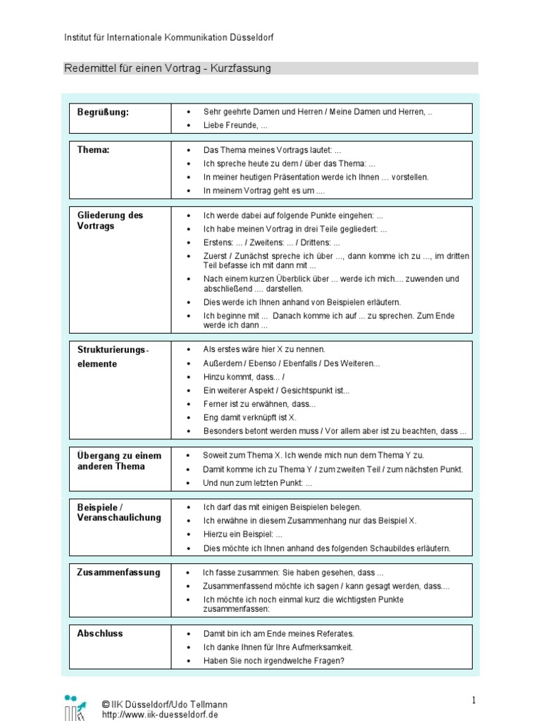Sehr geehrte Damen und Herren / Meine Damen und Herren, .. Liebe Freunde, ... Das Thema meines Vortrags lautet: ... Ich spreche heute zu dem / ber das Thema: ... In meiner heutigen Prsentation werde ich Ihnen vorstellen. In meinem Vortrag geht es um .... Ich werde dabei auf folgende Punkte eingehen: ... Ich habe meinen Vortrag in drei Teile gegliedert: ... Erstens: ... / Zweitens: ... / Drittens: ... Zuerst / Zunchst spreche ich ber ..., dann komme ich zu ..., im dritten Teil befasse ich mit dann mit ... Nach einem kurzen berblick ber ... werde ich mich.... zuwenden und abschlieend .... darstellen. Dies werde ich Ihnen anhand von Beispielen erlutern. Ich beginne mit ... Danach komme ich auf ... zu sprechen. Zum Ende werde ich dann ... Als erstes wre hier X zu nennen. Auerdem / Ebenso / Ebenfalls / Des Weiteren... Hinzu kommt, dass... / Ein weiterer Aspekt / Gesichtspunkt ist... Ferner ist zu erwhnen, dass... Eng damit verknpft ist X. Besonders betont werden muss / Vor allem aber ist zu beachten, dass ... Soweit zum Thema X. Ich wende mich nun dem Thema Y zu. Damit komme ich zu Thema Y / zum zweiten Teil / zum nchsten Punkt. Und nun zum letzten Punkt: ... Ich darf das mit einigen Beispielen belegen. Ich erwhne in diesem Zusammenhang nur das Beispiel X. Hierzu ein Beispiel: ... Dies mchte ich Ihnen anhand des folgenden Schaubildes erlutern. Ich fasse zusammen: Sie haben gesehen, dass ... Zusammenfassend mchte ich sagen / kann gesagt werden, dass.... Ich mchte ich noch einmal kurz die wichtigsten Punkte zusammenfassen: Damit bin ich am Ende meines Referates. Ich danke Ihnen fr Ihre Aufmerksamkeit. Haben Sie noch irgendwelche Fragen?