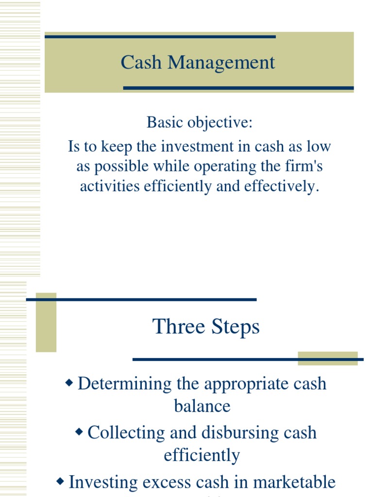 Determining the appropriate cash balance Collecting and disbursing cash efficiently Investing excess cash in marketable securities