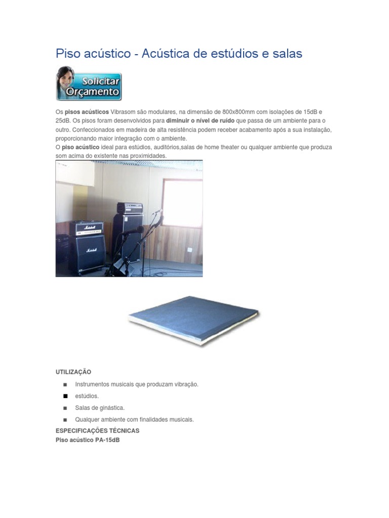 Os pisos acsticos Vibrasom so modulares, na dimenso de 800x800mm com isolaes de 15dB e 25dB. Os pisos foram desenvolvidos para diminuir o nvel de rudo que passa de um ambiente para o outro. Confeccionados em madeira de alta resistncia podem receber acabamento aps a sua instalao, proporcionando maior integrao com o ambiente. O piso acstico ideal para estdios, auditrios,salas de home theater ou qualquer ambiente que produza som acima do existente nas proximidades.