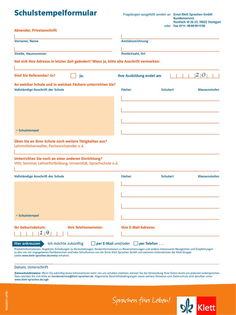 Schulstempelformular Fragebogen ausgefüllt senden an Ernst Klett Sprachen GmbH