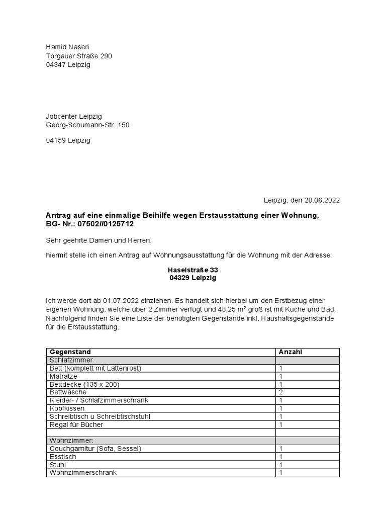 hiermit stelle ich einen Antrag auf Wohnungsausstattung für die Wohnung mit der Adresse: