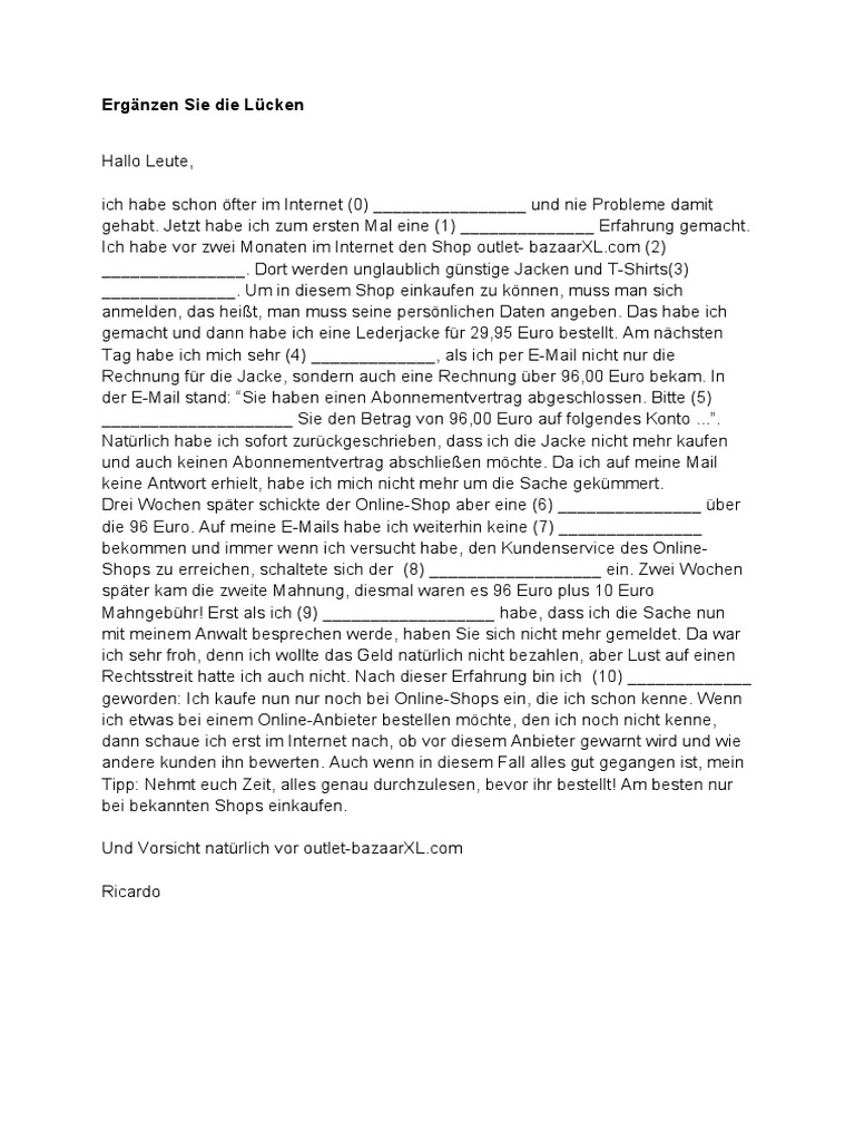Drei Wochen später schickte der Online-Shop aber eine (6) _______________ über