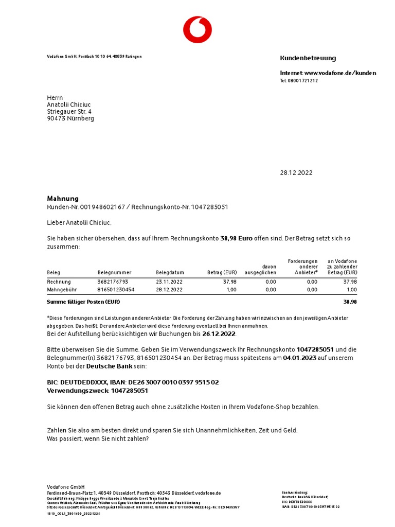 Vodafone GmbH, Postfach 10 10 64, 40839 Ratingen Kundenbetreuung
