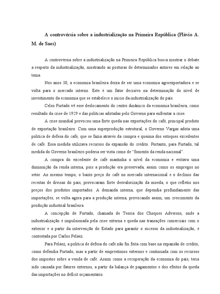 A controvrsia sobre a industrializao na Primeira Repblica busca mostrar o debate a respeito da industrializao, mostrando as posturas de determinados autores em relao ao tema. Nos anos 30, a economia brasileira deixa de ser uma economia agroexportadora e se volta para o mercado interno. Este um fator decisivo na determinao do nvel de investimento da economia que se estabelece o incio da industrializao do pas. Celso Furtado v esse deslocamento do centro dinmico da economia brasileira, como resultado da crise de 1929 e das polticas adotadas pelo Governo para enfrentar a crise. A crise mundial provocou uma forte queda nas exportaes do caf, principal produto de exportao brasileiro. Com uma superproduo estrutural, o Governo Vargas adota uma poltica de defesa do caf, que se fazia atravs da compra e queima dos estoques excedentes de caf. Essa medida utilizava recursos da expanso do crdito. Portanto, para Furtado, tal medida do Governo brasileiro poderia ser vista como de fomento da renda nacional. A compra do excedente de caf mantinha o nvel da economia e evitava uma diminuio da renda interna, pois a produo era preservada, assim como os empregos no setor. Ao mesmo tempo, o baixo preo do caf no mercado internacional e o declnio das receitas de divisas do pas, provocaram forte desvalorizao da moeda, o que refletiu nos preos dos produtos importados. A demanda interna, que dependia profundamente das importaes, se volta agora para a produo interna, provocando assim, um crescimento da produo industrial brasileira. A concepo de Furtado, chamada de Teoria dos Choques Adversos, onde a industrializao impulsionada pela crise externa e queda nas transaes comerciais com o exterior e a partir da interveno do Estado para garantir o sucesso da industrializao, contestada por Carlos Pelez. Para Pelez, a poltica de defesa do caf no foi feita com base na expanso de crdito, como defendia Furtado, mas a partir de emprstimos externos e continuada com os recursos dos impostos sobre a venda de caf. Assim como a recuperao da economia do pas, teria sido causada por fatores externos, a partir da balana de pagamentos e dos efeitos da queda das importaes no dficit oramentrio.