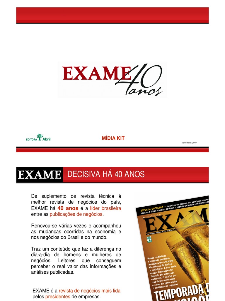 De suplemento de revista tcnica melhor revista de negcios do pas, EXAME h 40 anos a lder brasileira entre as publicaes de negcios. Renovou-se vrias vezes e acompanhou as mudanas ocorridas na economia e nos negcios do Brasil e do mundo. Traz um contedo que faz a diferena no dia-a-dia de homens e mulheres de negcios. Leitores que conseguem perceber o real valor das informaes e anlises publicadas.