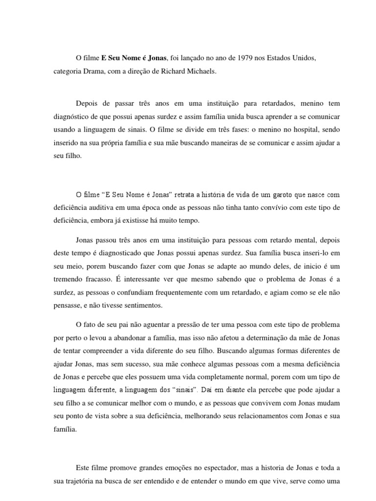 O filme E Seu Nome Jonas retrata a histria de vida de um garoto que nasce com deficincia auditiva em uma poca onde as pessoas no tinha tanto convvio com este tipo de deficincia, embora j existisse h muito tempo. Jonas passou trs anos em uma instituio para pessoas com retardo mental, depois deste tempo diagnosticado que Jonas possui apenas surdez. Sua famlia busca inseri-lo em seu meio, porem buscando fazer com que Jonas se adapte ao mundo deles, de inicio um tremendo fracasso. interessante ver que mesmo sabendo que o problema de Jonas a surdez, as pessoas o confundiam frequentemente com um retardado, e agiam como se ele no pensasse, e no tivesse sentimentos. O fato de seu pai no aguentar a presso de ter uma pessoa com este tipo de problema por perto o levou a abandonar a famlia, mas isso no afetou a determinao da me de Jonas de tentar compreender a vida diferente do seu filho. Buscando algumas formas diferentes de ajudar Jonas, mas sem sucesso, sua me conhece algumas pessoas com a mesma deficincia de Jonas e percebe que eles possuem uma vida completamente normal, porem com um tipo de linguagem diferente, a linguagem dos sinais. Da em diante ela percebe que pode ajudar a seu filho a se comunicar melhor com o mundo, e as pessoas que convivem com Jonas mudam seu ponto de vista sobre a sua deficincia, melhorando seus relacionamentos com Jonas e sua famlia.