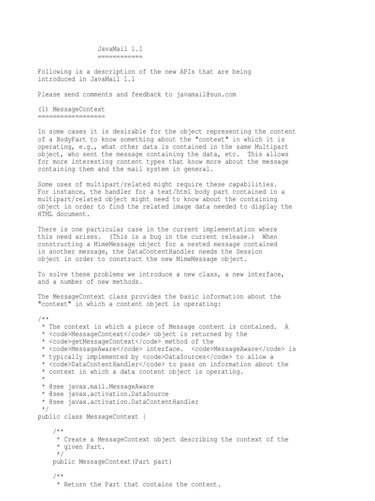 1 Please send comments and feedback to javamail@sun.com (1) MessageContext ================== In some cases it is desirable for the object representing the content of a BodyPart to know something about the "context" in which it is operating, e.g., what other data is contained in the same Multipart object, who sent the message containing the data, etc. This allows for more interesting content types that know more about the message containing them and the mail system in general. Some uses of multipart/related might require these capabilities. For instance, the handler for a text/html body part contained in a multipart/related object might need to know about the containing object in order to find the related image data needed to display the HTML document. There is one particular case in the current implementation where this need arises. (This is a bug in the current release.) When constructing a MimeMessage object for a nested message contained in another message, the DataContentHandler needs the Session object in order to construct the new MimeMessage object. To solve these problems we introduce a new class, a new interface, and a number of new methods. The MessageContext class provides the basic information about the "context" in which a content object is operating: /** * The context in which a piece of Message content is contained. A * <code>MessageContext</code> object is returned by the * <code>getMessageContext</code> method of the * <code>MessageAware</code> interface. <code>MessageAware</code> is * typically implemented by <code>DataSources</code> to allow a * <code>DataContentHandler</code> to pass on information about the * context in which a data content object is operating. * * @see javax.mail.MessageAware * @see javax.activation.DataSource * @see javax.activation.DataContentHandler */ public class MessageContext { /** * Create a MessageContext object describing the context of the * given Part. */ public MessageContext(Part part) /** * Return the Part that contains the content.