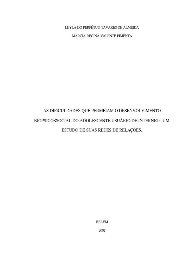 AS DIFICULDADES QUE PERMEIAM O DESENVOLVIMENTO BIOPSICOSSOCIAL DO ADOLESCENTE USURIO DE INTERNET: UM ESTUDO DE SUAS REDES DE RELAES.