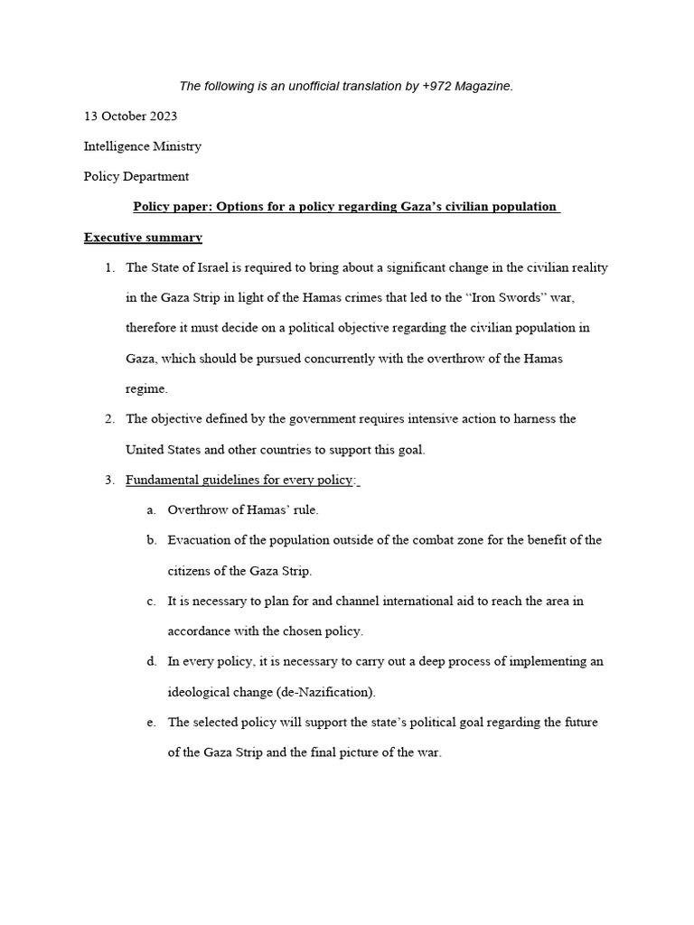 Israeli Intelligence Ministry Policy Paper On Gaza's Civilian Population, October 2023