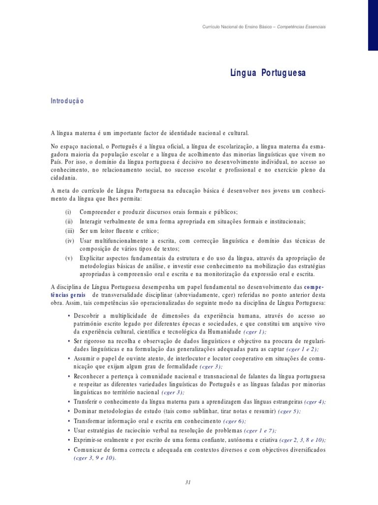 No espaço nacional, o Português é a língua oficial, a língua de escolarização, a língua materna da esma- gadora maioria da população escolar e a língua de acolhimento das minorias linguísticas que vivem no País. Por isso, o domínio da língua portuguesa é decisivo no desenvolvimento individual, no acesso ao conhecimento, no relacionamento social, no sucesso escolar e profissional e no exercício pleno da cidadania.