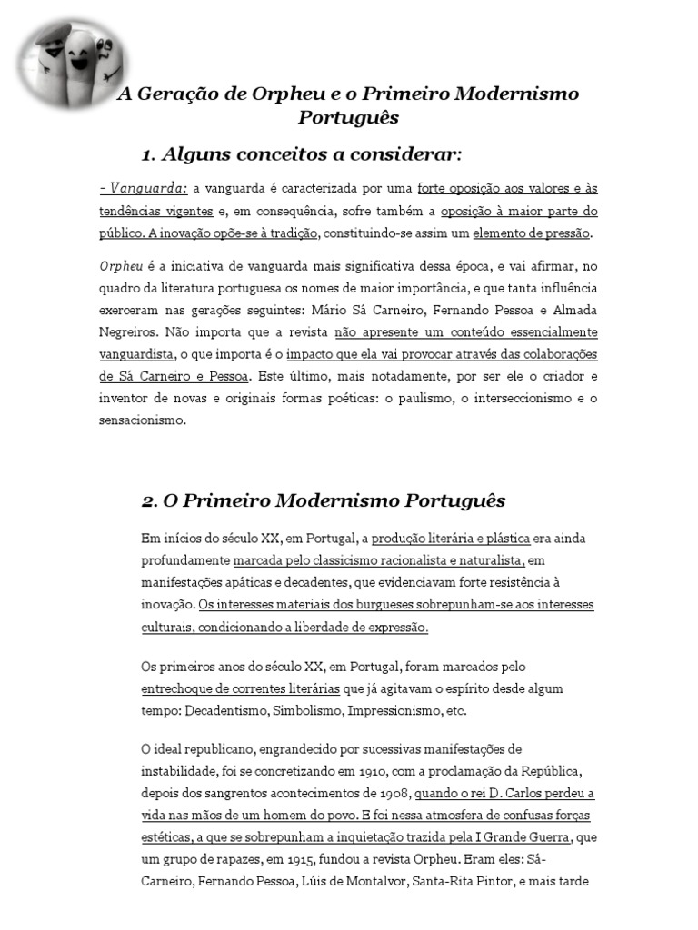 (No fcil precisar os limites cronolgios do Primeiro Modernismo em Portugal, mas certos livros dizem-nos que foi a partir de 1915, quando se formou o grupo da revista Orpheu (onde se esboa o primeiro movimento de vanguarda).