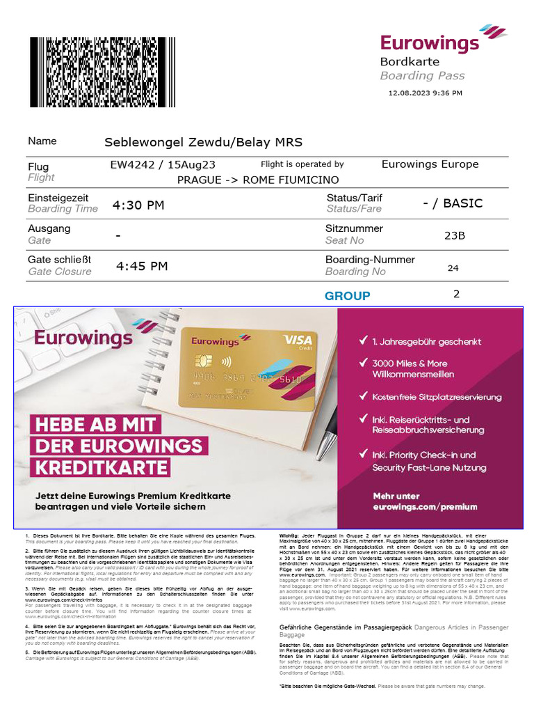gate* not later than the advised boarding time. Eurowings reserves the right to cancel your reservation if Baggage