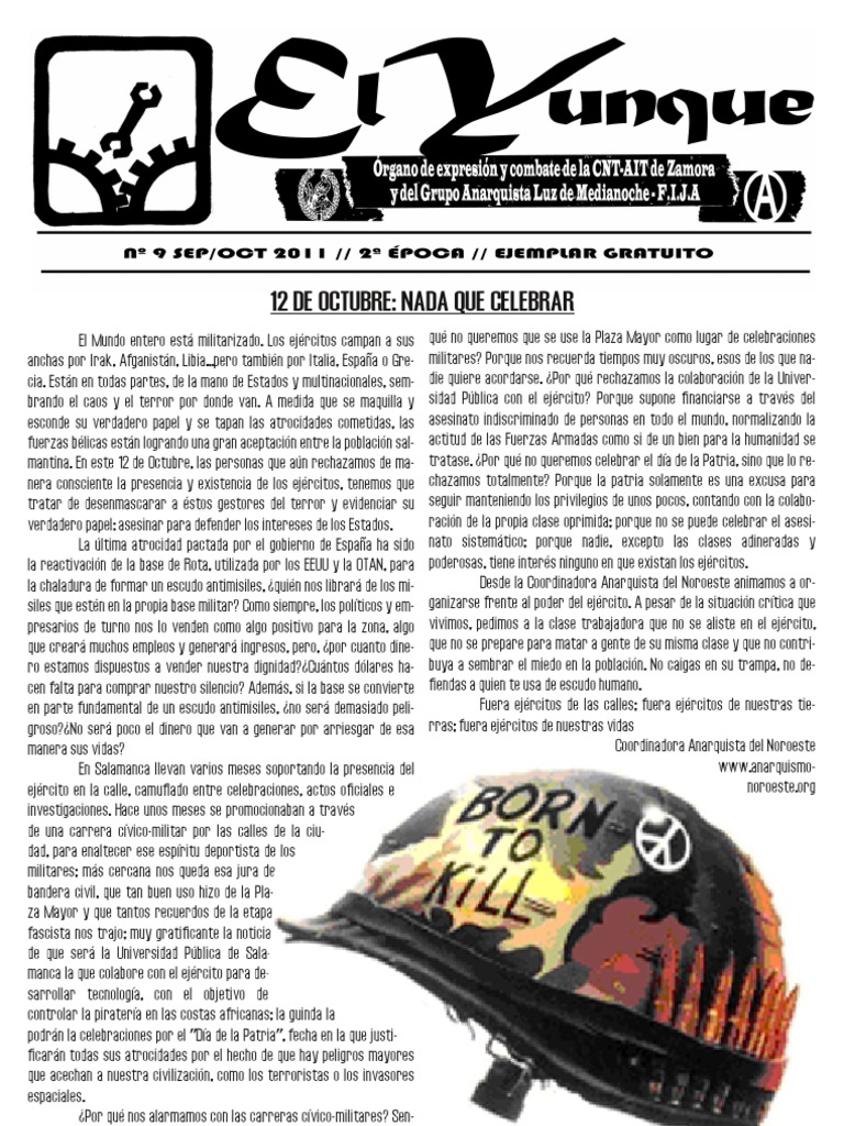 El Mundo entero est militarizado. Los ejrcitos campan a sus anchas por Irak, Afganistn, Libia...pero tambin por Italia, Espaa o Grecia. Estn en todas partes, de la mano de Estados y multinacionales, sembrando el caos y el terror por donde van. A medida que se maquilla y esconde su verdadero papel y se tapan las atrocidades cometidas, las fuerzas blicas estn logrando una gran aceptacin entre la poblacin salmantina. En este 12 de Octubre, las personas que an rechazamos de manera consciente la presencia y existencia de los ejrcitos, tenemos que tratar de desenmascarar a stos gestores del terror y evidenciar su verdadero papel: asesinar para defender los intereses de los Estados. La ltima atrocidad pactada por el gobierno de Espaa ha sido la reactivacin de la base de Rota, utilizada por los EEUU y la OTAN, para la chaladura de formar un escudo antimisiles, quin nos librar de los misiles que estn en la propia base militar? Como siempre, los polticos y empresarios de turno nos lo venden como algo positivo para la zona, algo que crear muchos empleos y generar ingresos, pero, por cuanto dinero estamos dispuestos a vender nuestra dignidad?Cuntos dlares hacen falta para comprar nuestro silencio? Adems, si la base se convierte en parte fundamental de un escudo antimisiles, no ser demasiado peligroso?No ser poco el dinero que van a generar por arriesgar de esa manera sus vidas? En Salamanca llevan varios meses soportando la presencia del ejrcito en la calle, camuflado entre celebraciones, actos oficiales e investigaciones. Hace unos meses se promocionaban a travs de una carrera cvico-militar por las calles de la ciudad, para enaltecer ese espritu deportista de los militares; ms cercana nos queda esa jura de bandera civil, que tan buen uso hizo de la Plaza Mayor y que tantos recuerdos de la etapa fascista nos trajo; muy gratificante la noticia de que ser la Universidad Pblica de Salamanca la que colabore con el ejrcito para desarrollar tecnologa, con el objetivo de controlar la piratera en las costas africanas; la guinda la podrn la celebraciones por el "Da de la Patria", fecha en la que justificarn todas sus atrocidades por el hecho de que hay peligros mayores que acechan a nuestra civilizacin, como los terroristas o los invasores espaciales. Por qu nos alarmamos con las carreras cvico-militares? Sencillamente, porque no est bien juntar a la vctima con el verdugo. Por qu no queremos que se use la Plaza Mayor como lugar de celebraciones militares? Porque nos recuerda tiempos muy oscuros, esos de los que nadie quiere acordarse. Por qu rechazamos la colaboracin de la Universidad Pblica con el ejrcito? Porque supone financiarse a travs del asesinato indiscriminado de personas en todo el mundo, normalizando la actitud de las Fuerzas Armadas como si de un bien para la humanidad se tratase. Por qu no queremos celebrar el da de la Patria, sino que lo rechazamos totalmente? Porque la patria solamente es una excusa para seguir manteniendo los privilegios de unos pocos, contando con la colaboracin de la propia clase oprimida; porque no se puede celebrar el asesinato sistemtico; porque nadie, excepto las clases adineradas y poderosas, tiene inters ninguno en que existan los ejrcitos. Desde la Coordinadora Anarquista del Noroeste animamos a organizarse frente al poder del ejrcito. A pesar de la situacin crtica que vivimos, pedimos a la clase trabajadora que no se aliste en el ejrcito, que no se prepare para matar a gente de su misma clase y que no contribuya a sembrar el miedo en la poblacin. No caigas en su trampa, no defiendas a quien te usa de escudo humano. Fuera ejrcitos de las calles; fuera ejrcitos de nuestras tierras; fuera ejrcitos de nuestras vidas Coordinadora Anarquista del Noroeste www.anarquismonoroeste.org
