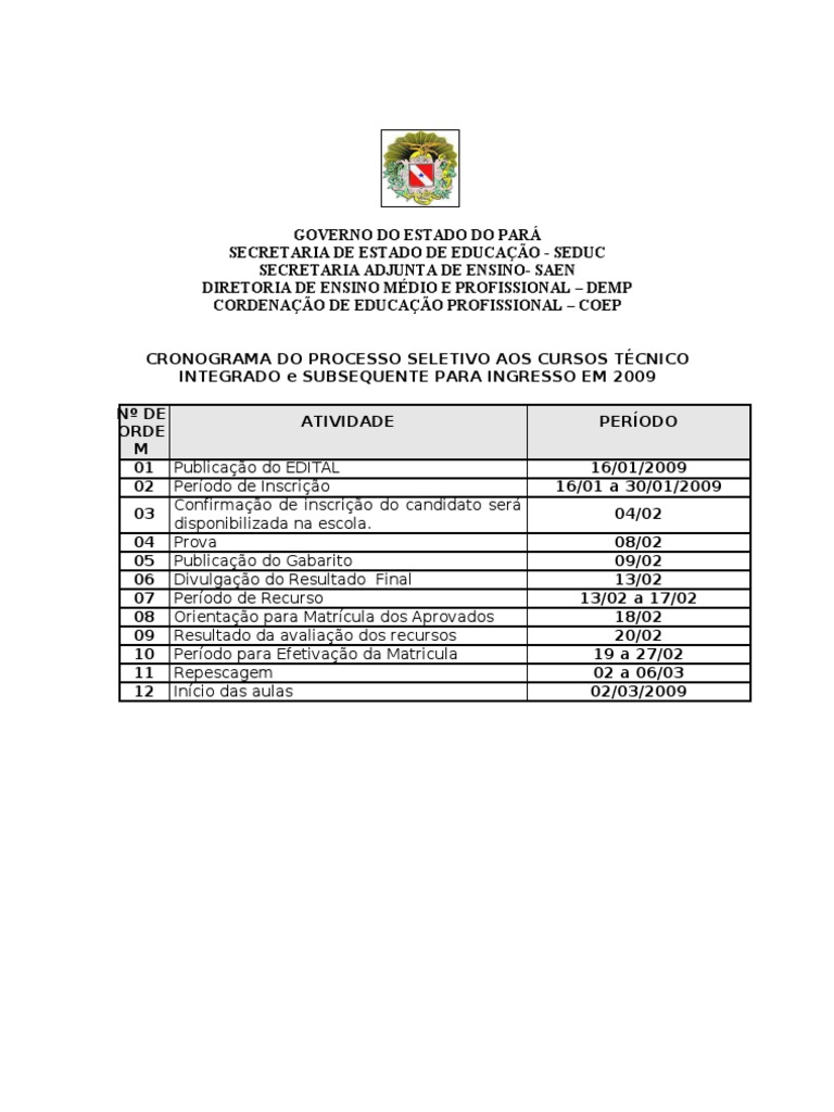 DEMP CORDENAO DE EDUCAO PROFISSIONAL COEP CRONOGRAMA DO PROCESSO SELETIVO AOS CURSOS TCNICO INTEGRADO e SUBSEQUENTE PARA INGRESSO EM 2009 N DE ATIVIDADE ORDE M 01 Publicao do EDITAL 02 Perodo de Inscrio Confirmao de inscrio do candidato ser 03 disponibilizada na escola. 04 Prova 05 Publicao do Gabarito 06 Divulgao do Resultado Final 07 Perodo de Recurso 08 Orientao para Matrcula dos Aprovados 09 Resultado da avaliao dos recursos 10 Perodo para Efetivao da Matricula 11 Repescagem 12 Incio das aulas PERODO 16/01/2009 16/01 a 30/01/2009 04/02 08/02 09/02 13/02 13/02 a 17/02 18/02 20/02 19 a 27/02 02 a 06/03 02/03/2009