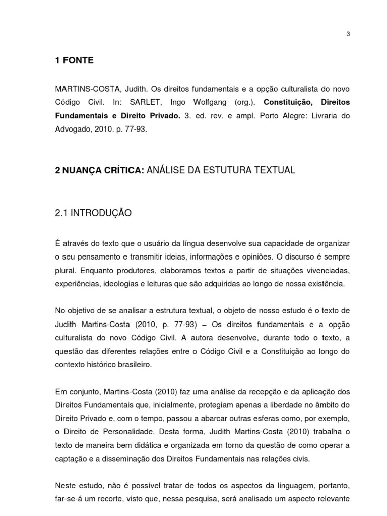 No objetivo de se analisar a estrutura textual, o objeto de nosso estudo o texto de Judith Martins-Costa (2010, p. 77-93) Os direitos fundamentais e a opo culturalista do novo Cdigo Civil. A autora desenvolve, durante todo o texto, a questo das diferentes relaes entre o Cdigo Civil e a Constituio ao longo do contexto histrico brasileiro.