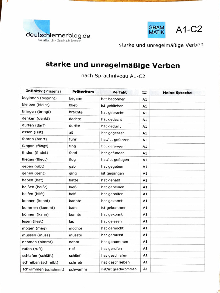 Ab Sprachniveau B1 solltet ihr dann das Präteritum aller Verben lernen.