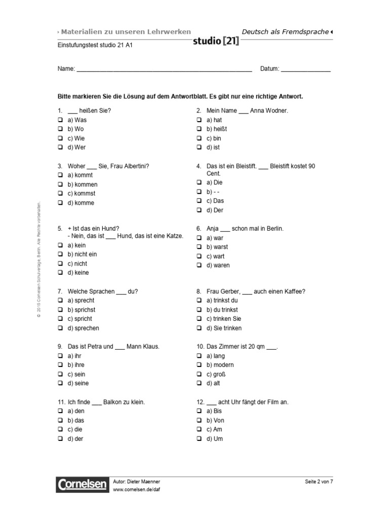 Bitte markieren Sie die Lösung auf dem Antwortblatt. Es gibt nur eine richtige Antwort.