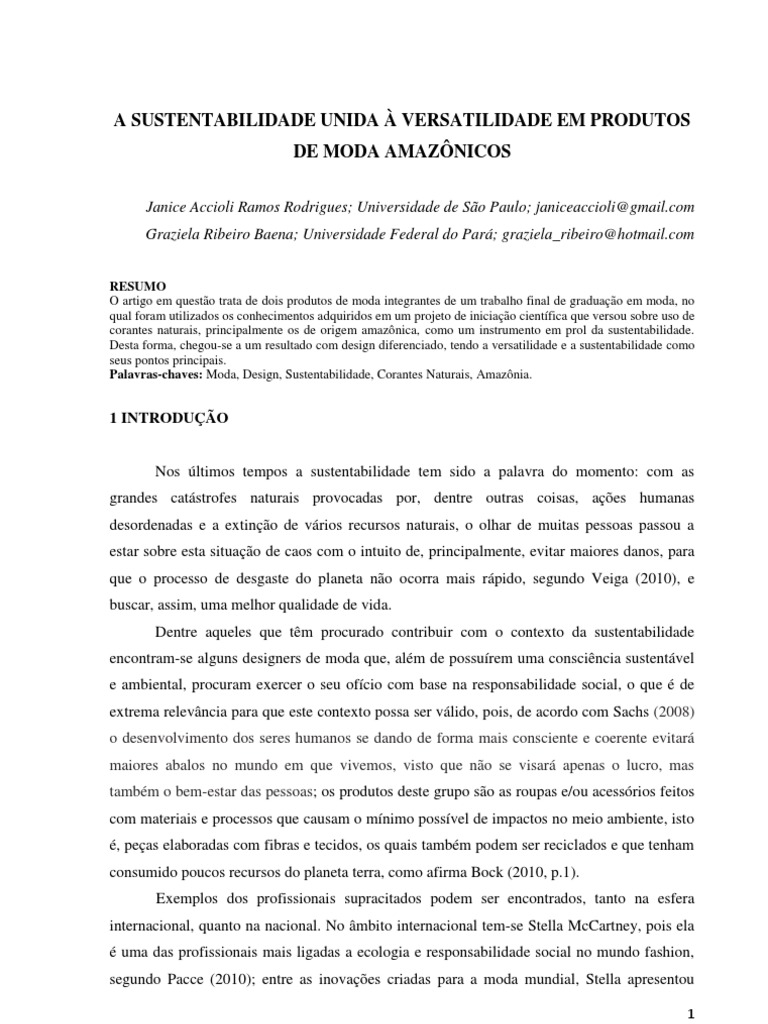 RESUMO O artigo em questo trata de dois produtos de moda integrantes de um trabalho final de graduao em moda, no qual foram utilizados os conhecimentos adquiridos em um projeto de iniciao cientfica que versou sobre uso de corantes naturais, principalmente os de origem amaznica, como um instrumento em prol da sustentabilidade. Desta forma, chegou-se a um resultado com design diferenciado, tendo a versatilidade e a sustentabilidade como seus pontos principais. Palavras-chaves: Moda, Design, Sustentabilidade, Corantes Naturais, Amaznia.