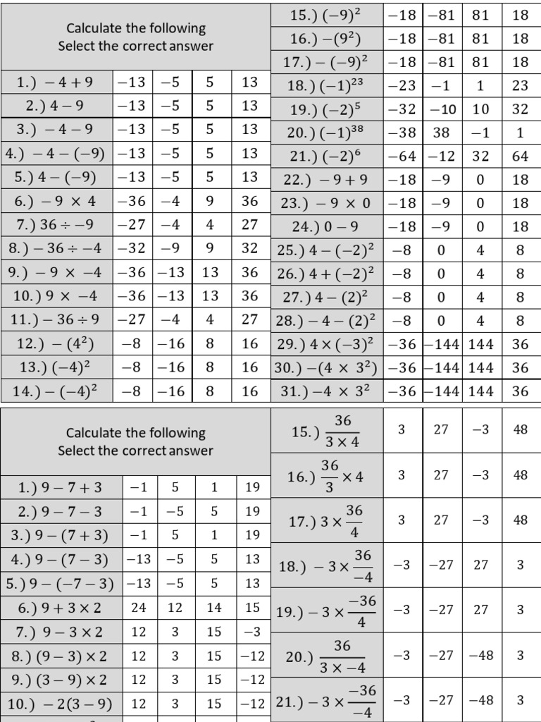 13. ) (−4)2 −8 −16 8 16 30. ) −(4 × 32 ) −36 −144 144 36