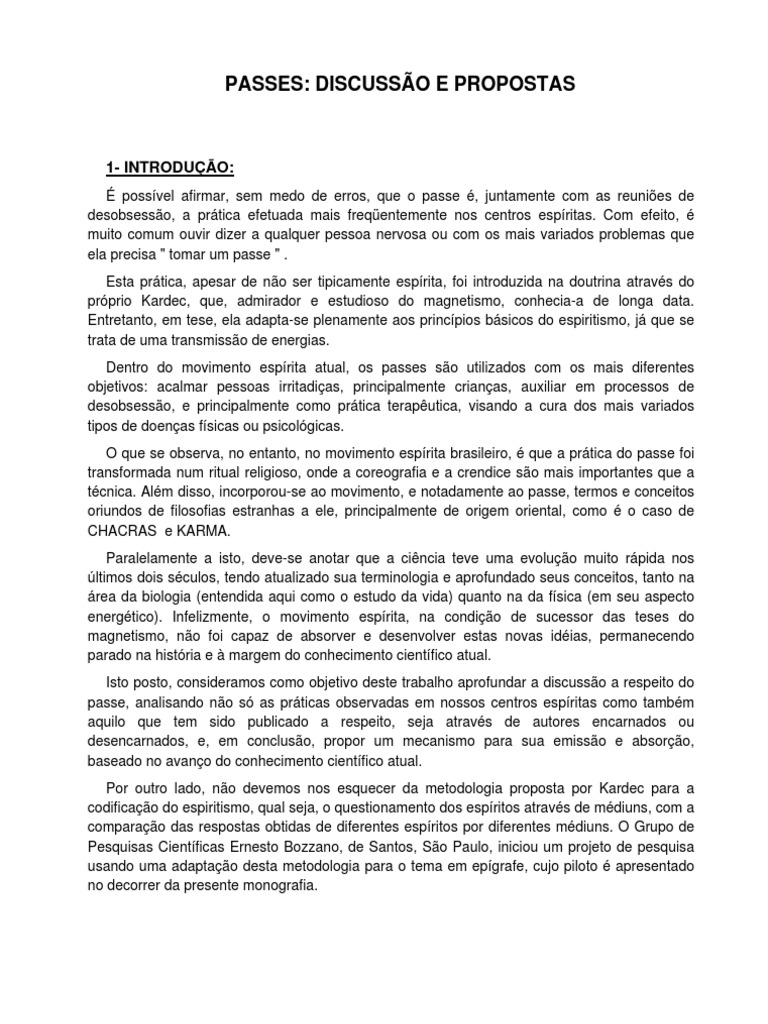 possvel afirmar, sem medo de erros, que o passe , juntamente com as reunies de desobsesso, a prtica efetuada mais freqentemente nos centros espritas. Com efeito, muito comum ouvir dizer a qualquer pessoa nervosa ou com os mais variados problemas que ela precisa " tomar um passe " . Esta prtica, apesar de no ser tipicamente esprita, foi introduzida na doutrina atravs do prprio Kardec, que, admirador e estudioso do magnetismo, conhecia-a de longa data. Entretanto, em tese, ela adapta-se plenamente aos princpios bsicos do espiritismo, j que se trata de uma transmisso de energias. Dentro do movimento esprita atual, os passes so utilizados com os mais diferentes objetivos: acalmar pessoas irritadias, principalmente crianas, auxiliar em processos de desobsesso, e principalmente como prtica teraputica, visando a cura dos mais variados tipos de doenas fsicas ou psicolgicas. O que se observa, no entanto, no movimento esprita brasileiro, que a prtica do passe foi transformada num ritual religioso, onde a coreografia e a crendice so mais importantes que a tcnica. Alm disso, incorporou-se ao movimento, e notadamente ao passe, termos e conceitos oriundos de filosofias estranhas a ele, principalmente de origem oriental, como o caso de CHACRAS e KARMA. Paralelamente a isto, deve-se anotar que a cincia teve uma evoluo muito rpida nos ltimos dois sculos, tendo atualizado sua terminologia e aprofundado seus conceitos, tanto na rea da biologia (entendida aqui como o estudo da vida) quanto na da fsica (em seu aspecto energtico). Infelizmente, o movimento esprita, na condio de sucessor das teses do magnetismo, no foi capaz de absorver e desenvolver estas novas idias, permanecendo parado na histria e margem do conhecimento cientfico atual. Isto posto, consideramos como objetivo deste trabalho aprofundar a discusso a respeito do passe, analisando no s as prticas observadas em nossos centros espritas como tambm aquilo que tem sido publicado a respeito, seja atravs de autores encarnados ou desencarnados, e, em concluso, propor um mecanismo para sua emisso e absoro, baseado no avano do conhecimento cientfico atual. Por outro lado, no devemos nos esquecer da metodologia proposta por Kardec para a codificao do espiritismo, qual seja, o questionamento dos espritos atravs de mdiuns, com a comparao das respostas obtidas de diferentes espritos por diferentes mdiuns. O Grupo de Pesquisas Cientficas Ernesto Bozzano, de Santos, So Paulo, iniciou um projeto de pesquisa usando uma adaptao desta metodologia para o tema em epgrafe, cujo piloto apresentado no decorrer da presente monografia.