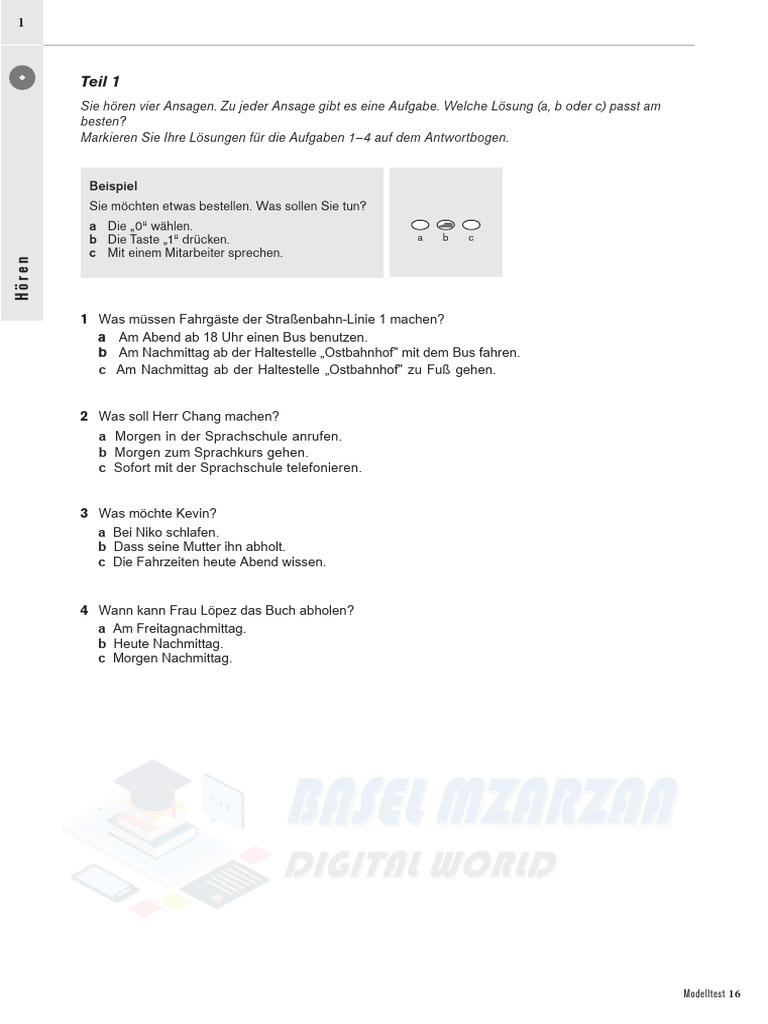 Sie hören vier Ansagen. Zu jeder Ansage gibt es eine Aufgabe. Welche Lösung (a, b oder c) passt am