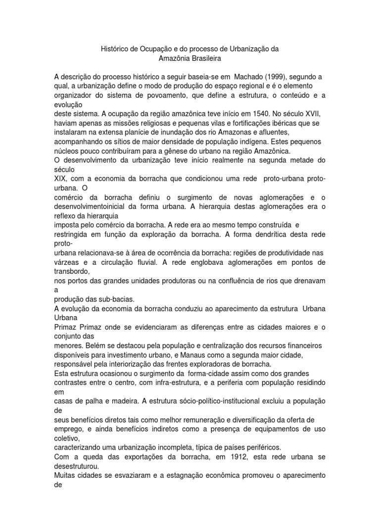 a urbanizao define o modo de produo do espao regional e o elemento organizador do sistema de povoamento, que define a estrutura, o contedo e a evoluo deste sistema. A ocupao da regio amaznica teve incio em 1540. No sculo XVII, haviam apenas as misses religiosas e pequenas vilas e fortificaes ibricas que se instalaram na extensa plancie de inundao dos rio Amazonas e afluentes, acompanhando os stios de maior densidade de populao indgena. Estes pequenos ncleos pouco contriburam para a gnese do urbano na regio Amaznica. O desenvolvimento da urbanizao teve incio realmente na segunda metade do sculo XIX, com a economia da borracha que condicionou uma rede proto-urbana protourbana. O comrcio da borracha definiu o surgimento de novas aglomeraes e o desenvolvimentoinicial da forma urbana. A hierarquia destas aglomeraes era o reflexo da hierarquia imposta pelo comrcio da borracha. A rede era ao mesmo tempo construda e restringida em funo da explorao da borracha. A forma dendrtica desta rede protourbana relacionava-se rea de ocorrncia da borracha: regies de produtividade nas vrzeas e a circulao fluvial. A rede englobava aglomeraes em pontos de transbordo, nos portos das grandes unidades produtoras ou na confluncia de rios que drenavam a produo das sub-bacias. A evoluo da economia da borracha conduziu ao aparecimento da estrutura Urbana Urbana Primaz Primaz onde se evidenciaram as diferenas entre as cidades maiores e o conjunto das menores. Belm se destacou pela populao e centralizao dos recursos financeiros disponveis para investimento urbano, e Manaus como a segunda maior cidade, responsvel pela interiorizao das frentes exploradoras de borracha. Esta estrutura ocasionou o surgimento da forma-cidade assim como dos grandes contrastes entre o centro, com infra-estrutura, e a periferia com populao residindo em casas de palha e madeira. A estrutura scio-poltico-institucional excluiu a populao de seus benefcios diretos tais como melhor remunerao e diversificao da oferta de emprego, e ainda benefcios indiretos como a presena de equipamentos de uso coletivo, caracterizando uma urbanizao incompleta, tpica de pases perifricos. Com a queda das exportaes da borracha, em 1912, esta rede urbana se desestruturou. Muitas cidades se esvaziaram e a estagnao econmica promoveu o aparecimento de