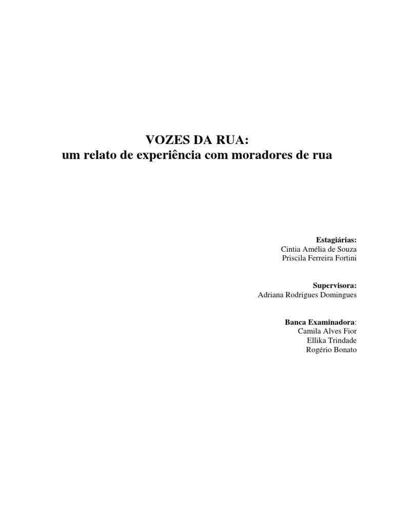Este trabalho apresenta um relato de uma experincia de estgio realizada com moradores de rua da cidade de Poos de Caldas MG. O Brasil se encontra entre os pases de maior desigualdade na distribuio de renda, gerando um sistema no qual o capital produzido fica destinado a uma minoria, em detrimento do avano dos quadros de misria e vulnerabilidade social. Neste contexto, percebemos um aumento progressivo de pessoas vivendo em situao de rua no municpio em questo. O objetivo do trabalho consistiu em promover um espao de dilogo e reflexo junto as pessoas em situao de rua, no que tange as questes referentes s suas vidas. Durante nove meses, realizamos um grupo de reflexo com moradores de rua abrigados em uma instituio de permanncia temporria. O grupo na sua maioria homens era marcadamente atravessado por experincias de dependncia qumica, sendo esta a principal demanda do mesmo. Conforme definido pelo grupo, semanalmente os participantes traziam os temas que seriam discutidos e as estagirias atuavam como problematizadoras das questes por eles trazidas. Os principais temas que surgiram e foram recorrentes no discurso destes moradores de rua foram: a famlia, o trabalho, a rua e as drogas. O tema famlia apresenta-se como lao social do passado que os conectam a um futuro melhor, longe das drogas; o trabalho, visto como identidade e funo social; a rua, surge como conseqncia do uso abusivo de lcool e drogas e o tema drogas, aparecem como uma possibilidade de enfrentar as dificuldades que a vida apresenta. A partir desta experincia, percebemos que a situao de rua desta cidade difere-se da realidade de grandes centros, conforme literatura referente ao assunto. Assim, observou-se a necessidade de se pensar polticas de preveno mais eficazes no que tange a dependncia qumica e a vulnerabilidade social para o municpio de Poos de Caldas.