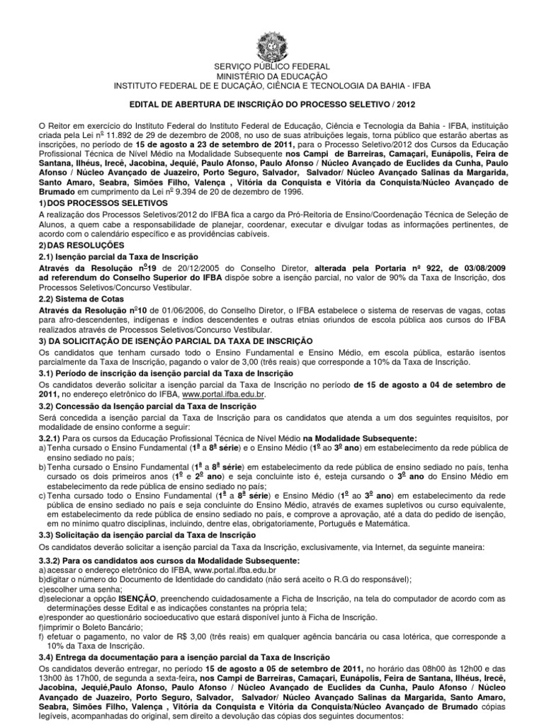 DO PROCESSO SELETIVO / 2012 O Reitor em exerccio do Instituto Federal do Instituto Federal de Educao, Cincia e Tecnologia da Bahia - IFBA, instituio o criada pela Lei n 11.892 de 29 de dezembro de 2008, no uso de suas atribuies legais, torna pblico que estaro abertas as inscries, no perodo de 15 de agosto a 23 de setembro de 2011, para o Processo Seletivo/2012 dos Cursos da Educao Profissional Tcnica de Nvel Mdio na Modalidade Subsequente nos Campi de Barreiras, Camaari, Eunpolis, Feira de Santana, Ilhus, Irec, Jacobina, Jequi, Paulo Afonso, Paulo Afonso / Ncleo Avanado de Euclides da Cunha, Paulo Afonso / Ncleo Avanado de Juazeiro, Porto Seguro, Salvador, Salvador/ Ncleo Avanado Salinas da Margarida, Santo Amaro, Seabra, Simes Filho, Valena , Vitria da Conquista e Vitria da Conquista/Ncleo Avanado de o Brumado em cumprimento da Lei n 9.394 de 20 de dezembro de 1996. 1) DOS PROCESSOS SELETIVOS A realizao dos Processos Seletivos/2012 do IFBA fica a cargo da Pr-Reitoria de Ensino/Coordenao Tcnica de Seleo de Alunos, a quem cabe a responsabilidade de planejar, coordenar, executar e divulgar todas as informaes pertinentes, de acordo com o calendrio especfico e as providncias cabveis. 2) DAS RESOLUES 2.1) Iseno parcial da Taxa de Inscrio o Atravs da Resoluo n 19 de 20/12/2005 do Conselho Diretor, alterada pela Portaria n 922, de 03/08/2009 ad referendum do Conselho Superior do IFBA dispe sobre a iseno parcial, no valor de 90% da Taxa de Inscrio, dos Processos Seletivos/Concurso Vestibular. 2.2) Sistema de Cotas o Atravs da Resoluo n 10 de 01/06/2006, do Conselho Diretor, o IFBA estabelece o sistema de reservas de vagas, cotas para afro-descendentes, indgenas e ndios descendentes e outras etnias oriundos de escola pblica aos cursos do IFBA realizados atravs de Processos Seletivos/Concurso Vestibular. 3) DA SOLICITAO DE ISENO PARCIAL DA TAXA DE INSCRIO Os candidatos que tenham cursado todo o Ensino Fundamental e Ensino Mdio, em escola pblica, estaro isentos parcialmente da Taxa de Inscrio, pagando o valor de 3,00 (trs reais) que corresponde a 10% da Taxa de Inscrio. 3.1) Perodo de inscrio da iseno parcial da Taxa de Inscrio Os candidatos devero solicitar a iseno parcial da Taxa de Inscrio no perodo de 15 de agosto a 04 de setembro de 2011, no endereo eletrnico do IFBA, www.portal.ifba.edu.br. 3.2) Concesso da Iseno parcial da Taxa de Inscrio Ser concedida a iseno parcial da Taxa de Inscrio para os candidatos que atenda a um dos seguintes requisitos, por modalidade de ensino conforme a seguir: 3.2.1) Para os cursos da Educao Profissional Tcnica de Nvel Mdio na Modalidade Subsequente: a a o o a) Tenha cursado o Ensino Fundamental (1 a 8 srie) e o Ensino Mdio (1 ao 3 ano) em estabelecimento da rede pblica de ensino sediado no pas; a a b) Tenha cursado o Ensino Fundamental (1 a 8 srie) em estabelecimento da rede pblica de ensino sediado no pas, tenha o o o cursado os dois primeiros anos (1 e 2 ano) e seja concluinte isto , esteja cursando o 3 ano do Ensino Mdio em estabelecimento da rede pblica de ensino sediado no pas; a a o o c) Tenha cursado todo o Ensino Fundamental (1 a 8 srie) e Ensino Mdio (1 ao 3 ano) em estabelecimento da rede pblica de ensino sediado no pas e seja concluinte do Ensino Mdio, atravs de exames supletivos ou curso equivalente, em estabelecimento da rede pblica de ensino sediado no pas, e comprove a aprovao, at a data do pedido de iseno, em no mnimo quatro disciplinas, incluindo, dentre elas, obrigatoriamente, Portugus e Matemtica. 3.3) Solicitao da iseno parcial da Taxa de Inscrio Os candidatos devero solicitar a iseno parcial da Taxa da Inscrio, exclusivamente, via Internet, da seguinte maneira: 3.3.2) Para os candidatos aos cursos da Modalidade Subsequente: a) acessar o endereo eletrnico do IFBA, www.portal.ifba.edu.br b)digitar o nmero do Documento de Identidade do candidato (no ser aceito o R.G do responsvel); c)escolher uma senha; d)selecionar a opo ISENO, preenchendo cuidadosamente a Ficha de Inscrio, na tela do computador de acordo com as determinaes desse Edital e as indicaes constantes na prpria tela; e)responder ao questionrio socioeducativo que estar disponvel junto Ficha de Inscrio. f)imprimir o Boleto Bancrio; f) efetuar o pagamento, no valor de R$ 3,00 (trs reais) em qualquer agncia bancria ou casa lotrica, que corresponde a 10% da Taxa de Inscrio. 3.4) Entrega da documentao para a iseno parcial da Taxa de Inscrio Os candidatos devero entregar, no perodo 15 de agosto a 05 de setembro de 2011, no horrio das 08h00 s 12h00 e das 13h00 s 17h00, de segunda a sexta-feira, nos Campi de Barreiras, Camaari, Eunpolis, Feira de Santana, Ilhus, Irec, Jacobina, Jequi,Paulo Afonso, Paulo Afonso / Ncleo Avanado de Euclides da Cunha, Paulo Afonso / Ncleo Avanado de Juazeiro, Porto Seguro, Salvador, Salvador/ Ncleo Avanado Salinas da Margarida, Santo Amaro, Seabra, Simes Filho, Valena , Vitria da Conquista e Vitria da Conquista/Ncleo Avanado de Brumado cpias legveis, acompanhadas do original, sem direito a devoluo das cpias dos seguintes documentos:
