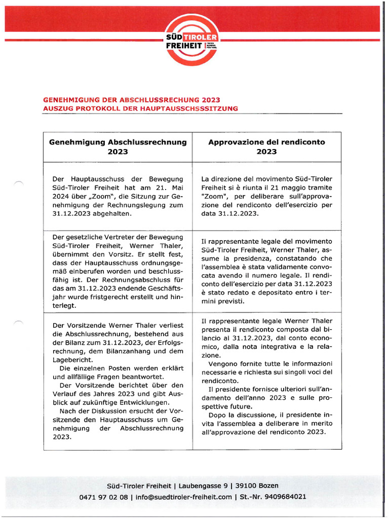 0471 97 02 08 | info@suedtiroler-freiheit.com | St.-Nr. 9409684021Genehmigung Jahresabschluss | Approvazione rendiconto [E7ERa