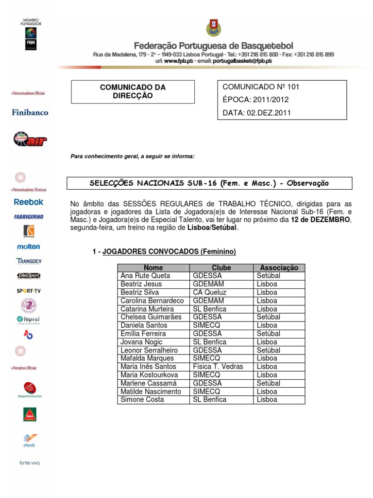 1 - JOGADORES CONVOCADOS (Feminino) Nome Ana Rute Queta Beatriz Jesus Beatriz Silva Carolina Bernardeco Catarina Murteira Chelsea Guimares Daniela Santos Emlia Ferreira Jovana Nogic Leonor Serralheiro Mafalda Marques Maria Ins Santos Maria Kostourkova Marlene Cassam Matilde Nascimento Simone Costa Clube GDESSA GDEMAM CA Queluz GDEMAM SL Benfica GDESSA SIMECQ GDESSA SL Benfica GDESSA SIMECQ Fsica T. Vedras SIMECQ GDESSA SIMECQ SL Benfica Associao Setbal Lisboa Lisboa Lisboa Lisboa Setbal Lisboa Setbal Lisboa Setbal Lisboa Lisboa Lisboa Setbal Lisboa Lisboa