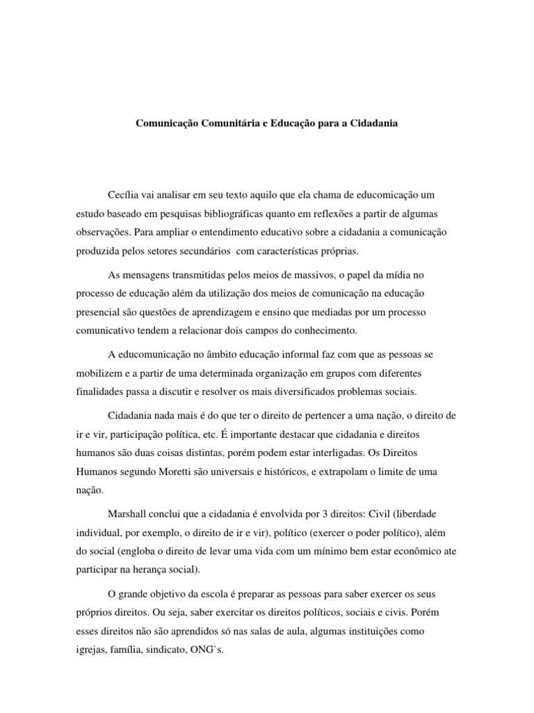 Ceclia vai analisar em seu texto aquilo que ela chama de educomicao um estudo baseado em pesquisas bibliogrficas quanto em reflexes a partir de algumas observaes. Para ampliar o entendimento educativo sobre a cidadania a comunicao produzida pelos setores secundrios com caractersticas prprias. As mensagens transmitidas pelos meios de massivos, o papel da mdia no processo de educao alm da utilizao dos meios de comunicao na educao presencial so questes de aprendizagem e ensino que mediadas por um processo comunicativo tendem a relacionar dois campos do conhecimento. A educomunicao no mbito educao informal faz com que as pessoas se mobilizem e a partir de uma determinada organizao em grupos com diferentes finalidades passa a discutir e resolver os mais diversificados problemas sociais. Cidadania nada mais do que ter o direito de pertencer a uma nao, o direito de ir e vir, participao poltica, etc. importante destacar que cidadania e direitos humanos so duas coisas distintas, porm podem estar interligadas. Os Direitos Humanos segundo Moretti so universais e histricos, e extrapolam o limite de uma nao. Marshall conclui que a cidadania envolvida por 3 direitos: Civil (liberdade individual, por exemplo, o direito de ir e vir), poltico (exercer o poder poltico), alm do social (engloba o direito de levar uma vida com um mnimo bem estar econmico ate participar na herana social). O grande objetivo da escola preparar as pessoas para saber exercer os seus prprios direitos. Ou seja, saber exercitar os direitos polticos, sociais e civis. Porm esses direitos no so aprendidos s nas salas de aula, algumas instituies como igrejas, famlia, sindicato, ONG`s.