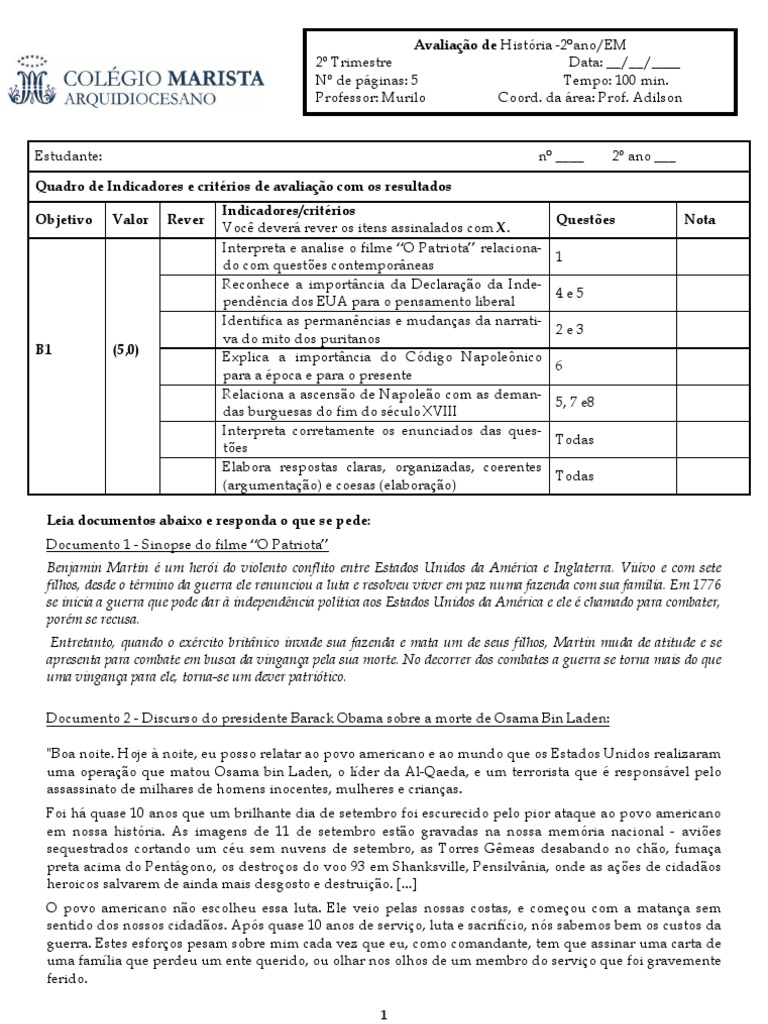 Leia documentos abaixo e responda o que se pede: Documento 1 - Sinopse do filme O Patriota Benjamin Martin um heri do violento conflito entre Estados Unidos da Amrica e Inglaterra. Vivo e com sete filhos, desde o trmino da guerra ele renunciou a luta e resolveu viver em paz numa fazenda com sua famlia. Em 1776 se inicia a guerra que pode dar independncia poltica aos Estados Unidos da Amrica e ele chamado para combater, porm se recusa. Entretanto, quando o exrcito britnico invade sua fazenda e mata um de seus filhos, Martin muda de atitude e se apresenta para combate em busca da vingana pela sua morte. No decorrer dos combates a guerra se torna mais do que uma vingana para ele, torna-se um dever patritico. Documento 2 - Discurso do presidente Barack Obama sobre a morte de Osama Bin Laden: "Boa noite. Hoje noite, eu posso relatar ao povo americano e ao mundo que os Estados Unidos realizaram uma operao que matou Osama bin Laden, o lder da Al-Qaeda, e um terrorista que responsvel pelo assassinato de milhares de homens inocentes, mulheres e crianas. Foi h quase 10 anos que um brilhante dia de setembro foi escurecido pelo pior ataque ao povo americano em nossa histria. As imagens de 11 de setembro esto gravadas na nossa memria nacional - avies sequestrados cortando um cu sem nuvens de setembro, as Torres Gmeas desabando no cho, fumaa preta acima do Pentgono, os destroos do voo 93 em Shanksville, Pensilvnia, onde as aes de cidados heroicos salvarem de ainda mais desgosto e destruio. [...] O povo americano no escolheu essa luta. Ele veio pelas nossas costas, e comeou com a matana sem sentido dos nossos cidados. Aps quase 10 anos de servio, luta e sacrifcio, ns sabemos bem os custos da guerra. Estes esforos pesam sobre mim cada vez que eu, como comandante, tem que assinar uma carta de uma famlia que perdeu um ente querido, ou olhar nos olhos de um membro do servio que foi gravemente ferido. 1