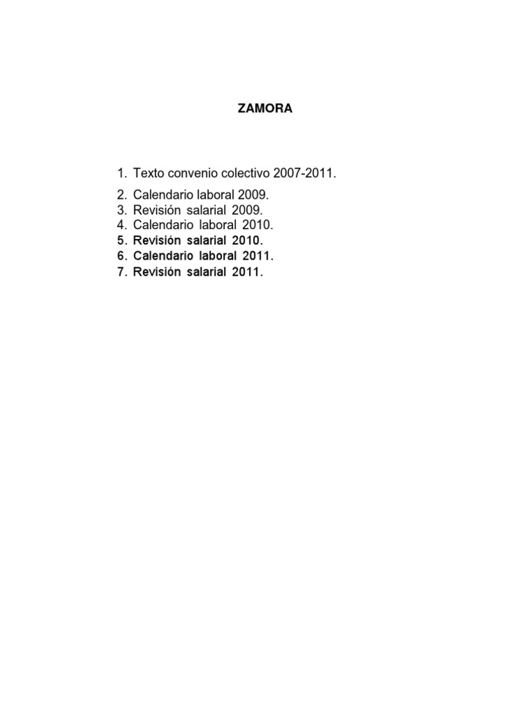 1. Texto convenio colectivo 2007-2011. 2. 3. 4. 5. 6. 7. Calendario laboral 2009. Revisin salarial 2009. Calendario laboral 2010. Revisin salarial 2010. Calendario laboral 2011. Revisin salarial 2011.