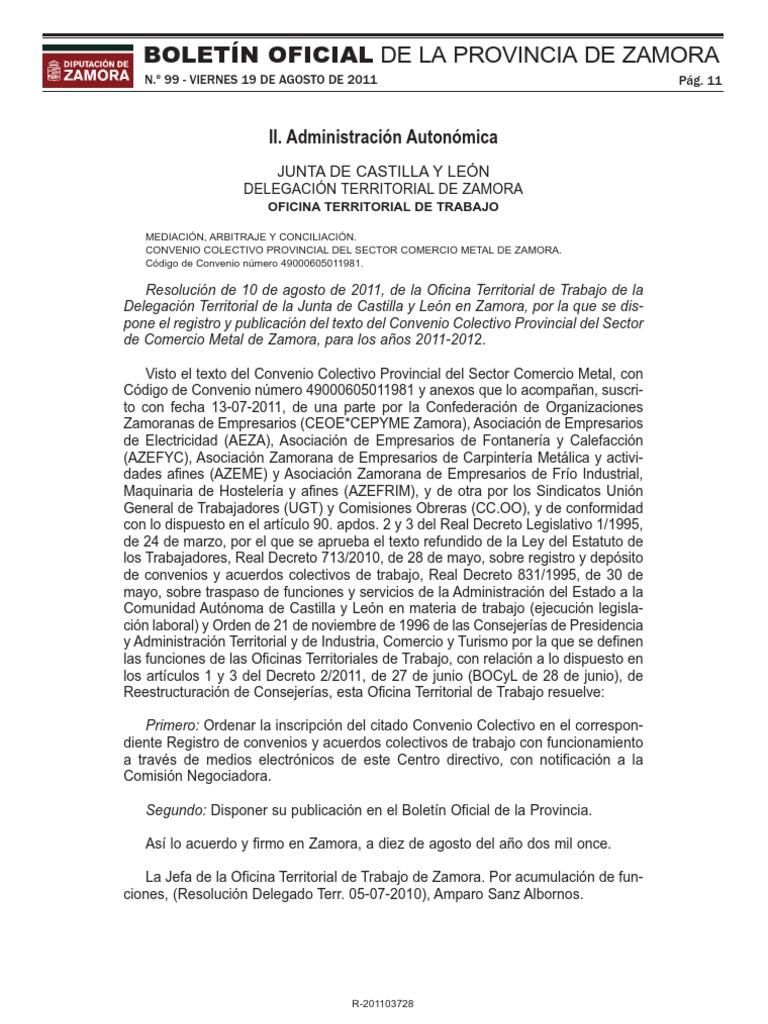 Visto el texto del Convenio Colectivo Provincial del Sector Comercio Metal, con Código de Convenio número 49000605011981 y anexos que lo acompañan, suscri- to con fecha 13-07-2011, de una parte por la Confederación de Organizaciones Zamoranas de Empresarios (CEOE*CEPYME Zamora), Asociación de Empresarios de Electricidad (AEZA), Asociación de Empresarios de Fontanería y Calefacción (AZEFYC), Asociación Zamorana de Empresarios de Carpintería Metálica y activi- dades afines (AZEME) y Asociación Zamorana de Empresarios de Frío Industrial, Maquinaria de Hostelería y afines (AZEFRIM), y de otra por los Sindicatos Unión General de Trabajadores (UGT) y Comisiones Obreras (CC.OO), y de conformidad con lo dispuesto en el artículo 90. apdos. 2 y 3 del Real Decreto Legislativo 1/1995, de 24 de marzo, por el que se aprueba el texto refundido de la Ley del Estatuto de los Trabajadores, Real Decreto 713/2010, de 28 de mayo, sobre registro y depósito de convenios y acuerdos colectivos de trabajo, Real Decreto 831/1995, de 30 de mayo, sobre traspaso de funciones y servicios de la Administración del Estado a la Comunidad Autónoma de Castilla y León en materia de trabajo (ejecución legisla- ción laboral) y Orden de 21 de noviembre de 1996 de las Consejerías de Presidencia y Administración Territorial y de Industria, Comercio y Turismo por la que se definen las funciones de las Oficinas Territoriales de Trabajo, con relación a lo dispuesto en los artículos 1 y 3 del Decreto 2/2011, de 27 de junio (BOCyL de 28 de junio), de Reestructuración de Consejerías, esta Oficina Territorial de Trabajo resuelve: