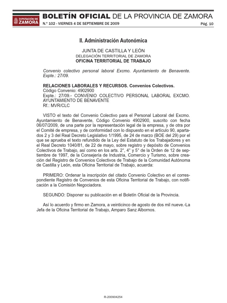 CONVENIO COLECTIVO PARA EL PERSONAL LABORAL DEL EXCELENTISIMO AYUNTAMIENTO DE BENAVENTE Art. 1. - PARTES CONCERTANTES El presente Convenio Colectivo se establece entre el Ayuntamiento de Benavente y el personal laboral del mismo y es concertado por los representantes legales del personal laboral del Excmo. Ayuntamiento de Benavente y por la representacin del propio Ayuntamiento, de conformidad con las disposiciones vigentes. Art. 2. - MBITO PERSONAL, FUNCIONAL Y TERRITORIAL. El presente Convenio Colectivo, de aplicacin en el trmino municipal de Benavente, establece y regula las normas y condiciones de trabajo del personal que, con relacin jurdico-laboral, presta servicios para el Ayuntamiento de Benavente, con la sola excepcin de los trabajadores cuyos contratos se realicen con cargo a: Fondos Europeos, Diputacin, INEM, Junta de Castilla y Len, y en general, de cualquier Administracin o Institucin de carcter pblico, a quienes se les aplicar el convenio colectivo sectorial de la actividad que se subvenciona en el caso de que as lo exija la convocatoria de la subvencin, pacto o convenio y, en defecto de esta exigencia concreta, se les aplicar el presente convenio colectivo en todas sus prescripciones, con excepcin de los aspectos retributivos de dichos contratos, que se regularn por lo dispuesto en la respectiva convocatoria de subvenciones, pacto o convenio que regule su contratacin. Art. 3. - MBITO TEMPORAL. El presente Convenio entrar en vigor, previa aprobacin por el Pleno de la Corporacin y con independencia de la fecha de su publicacin en el Boletn Oficial de la Provincia de Zamora, el da 1 de enero de 2.008 y su duracin ser hasta el 31 de diciembre de 2.011, con las salvedades y particularidades que para determinados conceptos econmicos se especifican en el presente Convenio. Los conceptos econmicos sern revisados anualmente en la cuanta prevista por la Ley de Presupuestos Generales del Estado para los empleados pblicos. Art. 4. - DENUNCIA El convenio podr ser denunciado por cualquiera de las partes, si bien la denuncia deber efectuarse por escrito y con una antelacin mnima de dos meses a la fecha en que finalice su vigencia. En caso de no existir denuncia expresa, quedar denunciado automticamente el ltimo da de su plazo de vigencia, comprometindose las partes a iniciar negociaciones en el ltimo trimestre del ao de finalizacin de su vigencia. Este convenio se entender prorrogado durante el tiempo que medie entre la fecha de su expiracin y la entrada en vigor del nuevo convenio que lo sustituya. Art. 5. - COMPENSACIN Y ABSORCIN. Las retribuciones establecidas en el presente Convenio Colectivo mantendrn todas las existentes en el momento de su entrada en vigor, cualquiera que sea la naturaleza y origen de las mismas, excepto las que se pacten en el articulado del presente convenio.