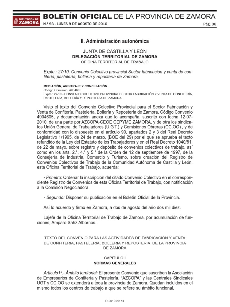 Visto el texto del Convenio Colectivo Provincial para el Sector Fabricacin y Venta de Confitera, Pastelera, Bollera y Repostera de Zamora, Cdigo Convenio 4904605, y documentacin anexa que lo acompaa, suscrito con fecha 12-072010, de una parte por AZCOPA-CEOE CEPYME ZAMORA, y de otra los sindicatos Unin General de Trabajadores (U.G.T.) y Comisiones Obreras (CC.OO) , y de conformidad con lo dispuesto en el artculo 90, apartados 2 y 3 del Real Decreto Legislativo 1/1995, de 24 de marzo, (BOE del 29) por el que se aprueba el texto refundido de la Ley del Estatuto de los Trabajadores y en el Real Decreto 1040/81, de 22 de mayo, sobre registro y depsito de convenios colectivos de trabajo, as como en los arts. 2., 4. y 5. de la Orden de 12 de septiembre de 1997, de la Consejera de Industria, Comercio y Turismo, sobre creacin del Registro de Convenios Colectivos de Trabajo de la Comunidad Autnoma de Castilla y Len, esta Oficina Territorial de Trabajo, acuerda: - Primero: Ordenar la inscripcin del citado Convenio Colectivo en el correspondiente Registro de Convenios de esta Oficina Territorial de Trabajo, con notificacin a la Comisin Negociadora. - Segundo: Disponer su publicacin en el Boletn Oficial de la Provincia. As lo acuerdo y firmo en Zamora, a dos de agosto del ao dos mil diez. Lajefe de la Oficina Territorial de Trabajo de Zamora, por acumulacin de funciones, Amparo Sahz Albornos.