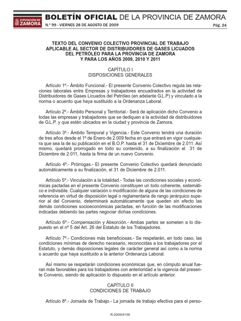 TEXTO DEL CONVENIO COLECTIVO PROVINCIAL DE TRABAJO APLICABLE AL SECTOR DE DISTRIBUIDORES DE GASES LICUADOS DEL PETRLEO PARA LA PROVINCIA DE ZAMORA Y PARA LOS AOS 2009, 2010 Y 2011 CAPTULO I DISPOSICIONES GENERALES Artculo 1.- mbito Funcional.- El presente Convenio Colectivo regula las relaciones laborales entre Empresas y trabajadores encuadrados en la actividad de Distribuidores de Gases Licuados del Petrleo (en adelante G.L.P) y vinculado a la norma o acuerdo que haya sustituido a la Ordenanza Laboral. Artculo 2.- mbito Personal y Territorial.- Ser de aplicacin dicho Convenio a todas las empresas y trabajadores que se dediquen a la actividad de distribuidores de G.L.P. y que estn ubicados en la ciudad y provincia de Zamora. Artculo 3.- mbito Temporal y Vigencia.- Este Convenio tendr una duracin de tres aos desde el 1 de Enero de 2.009 fecha en que entrar en vigor cualquiera que sea la de su publicacin en el B.O.P. hasta el 31 de Diciembre de 2.011. As mismo, quedar prorrogado en todo su contenido, a su finalizacin el 31 de Diciembre de 2.011, hasta la firma de un nuevo Convenio. Artculo 4.- Prrrogas.- El presente Convenio Colectivo quedar denunciado automticamente a su finalizacin, el 31 de Diciembre de 2.011. Artculo 5.- Vinculacin a la totalidad.- Todas las condiciones sociales y econmicas pactadas en el presente Convenio constituyen un todo coherente, sistemtico e indivisible. Cualquier variacin o modificacin de alguna de las condiciones de referencia en virtud de disposicin legal o reglamentaria de rango jerrquico superior al del Convenio, determinar automticamente que queden sin efecto las dems condiciones socioeconmicas pactadas, en funcin de las modificaciones indicadas debiendo las partes negociar dichas condiciones. Artculo 6.- Compensacin y Absorcin.- Ambas partes se someten a lo dispuesto en el n 5 del Art. 26 del Estatuto de los Trabajadores. Artculo 7.- Condiciones ms beneficiosas.- Se respetarn, en todo caso, las condiciones mnimas de derecho necesario, reconocidas a los trabajadores por el Estatuto, y dems disposiciones legales de carcter general as como a la norma o acuerdo que haya sustituido a la anterior Ordenanza Laboral. As mismo se respetarn condiciones econmicas que, en cmputo anual fueran ms favorables para los trabajadores con anterioridad a la vigencia del presente Convenio, siendo de aplicacin lo dispuesto en el artculo anterior. CAPTULO II CONDICIONES DE TRABAJO Artculo 8.- Jornada de Trabajo.- La jornada de trabajo efectiva para el persoR-200904156