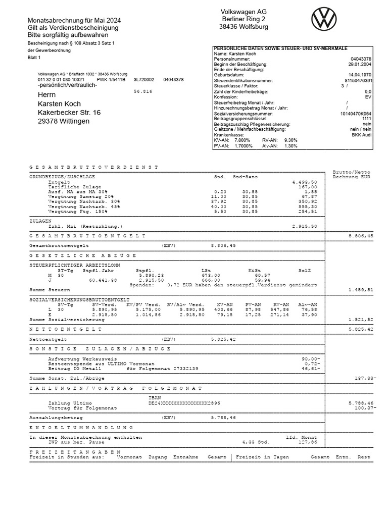 Gilt als Verdienstbescheinigung 38436 Wolfsburg