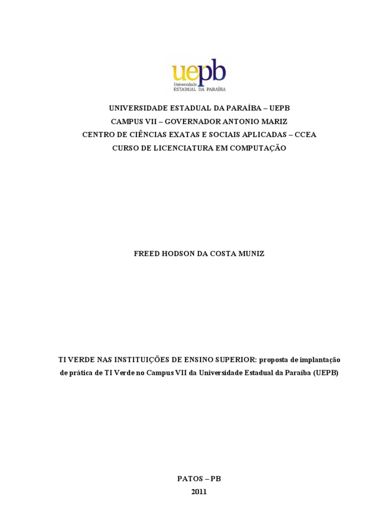 MUNIZ, Freed Hodson da Costa TI Verde nas Instituies de Ensino Superior: proposta de implantao de prtica de TI verde no Campus VII da Universidade Estadual da Paraba (UEPB) / Freed Hodson da Costa Muniz. Patos: UEPB, 2011. 32f Artigo (Trabalho de Concluso de Curso (TCC) - Universidade Estadual da Paraba. Orientador: Prof. Msc. Pablo Ribeiro Surez.